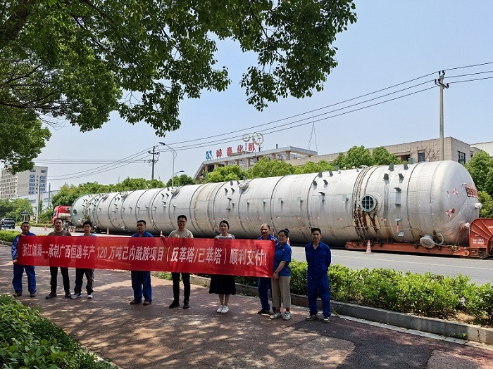 我公司承制的廣西恒逸年產 120 萬噸己內酰胺項目反萃塔 / 己萃塔已順利交付業主。作為與清華大學合作的產品,該設備集 "大體積、高難度、復雜工藝" 等特性于一體。自承接項目起,公司立即啟動統籌化生產規劃,針對客戶 “急、難、快” 的需求形成快速響應機制,通過全流程科學調度高效完成制造任務。